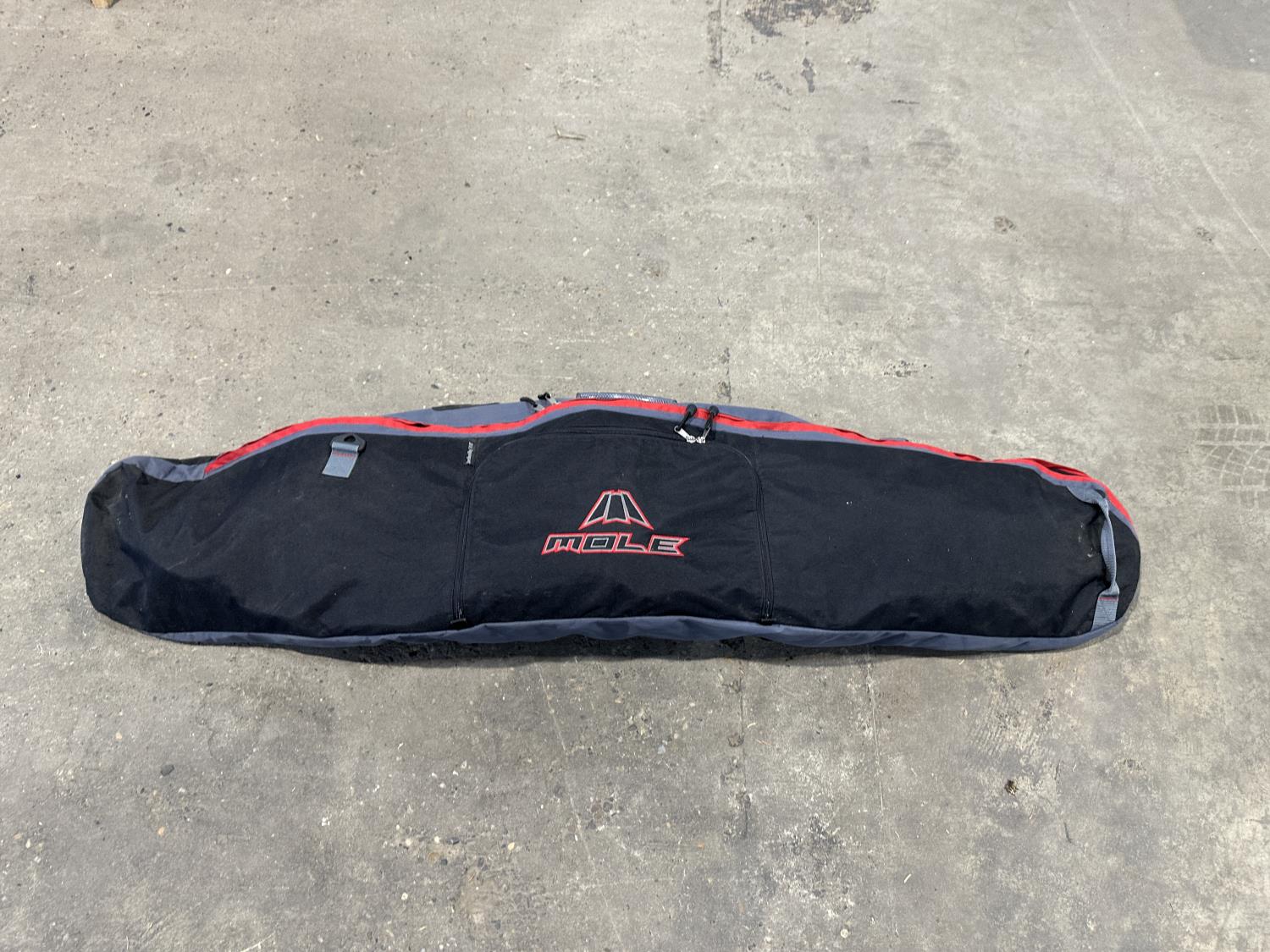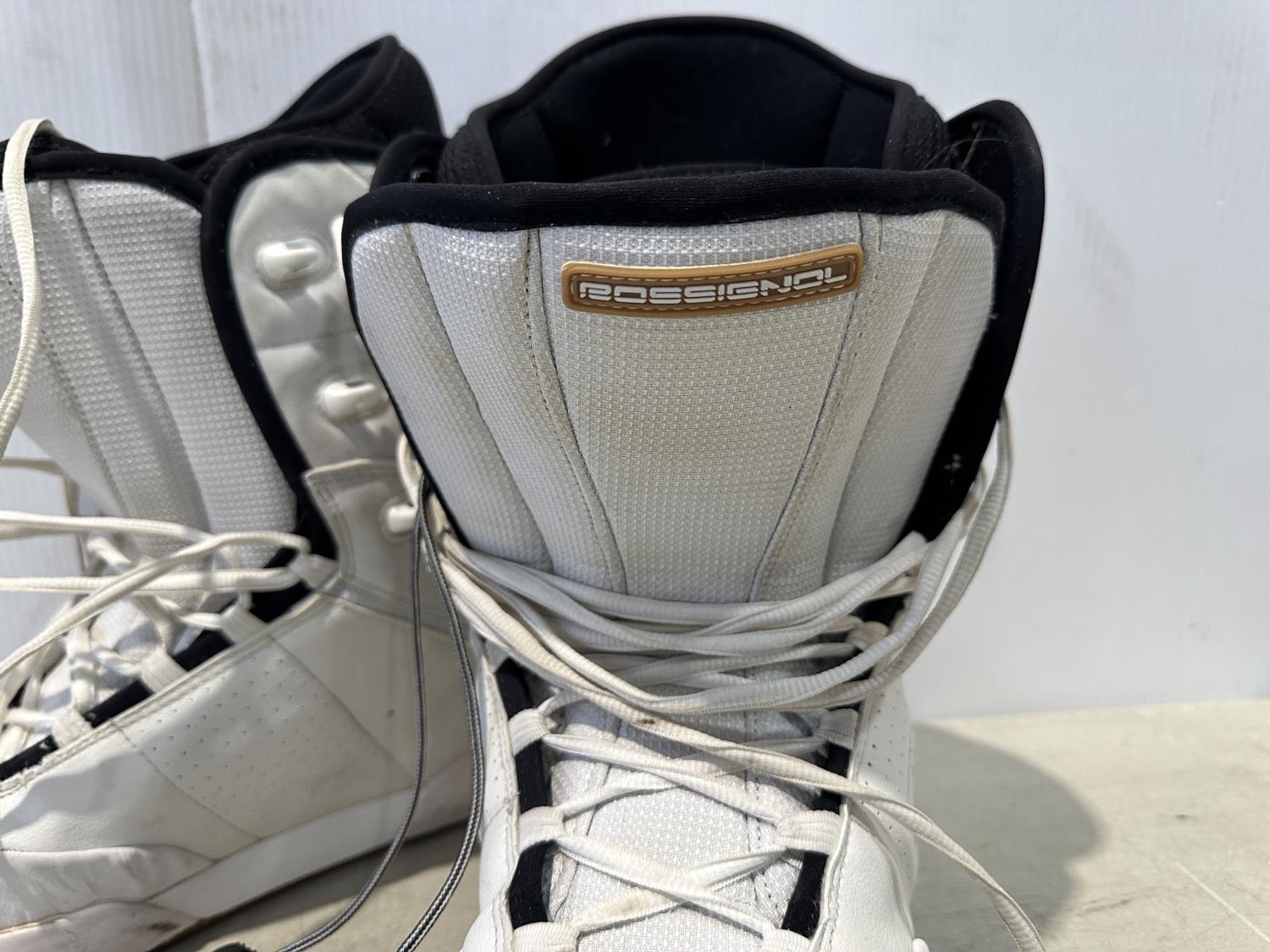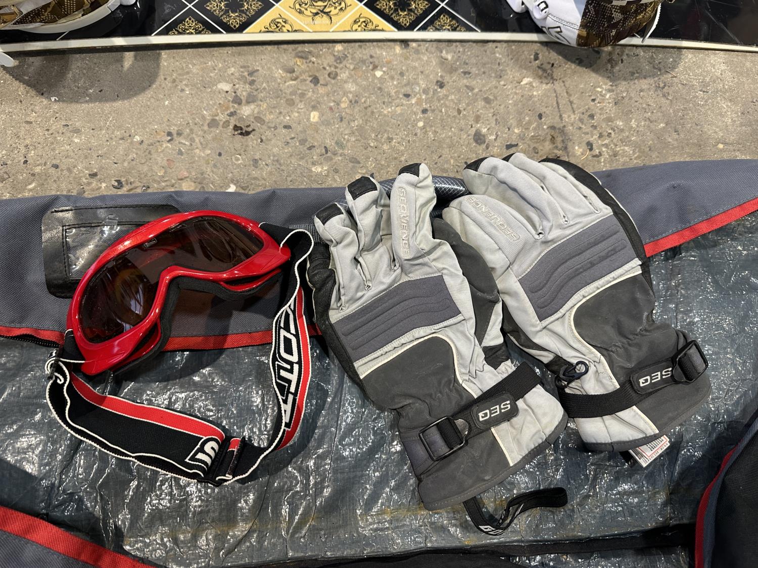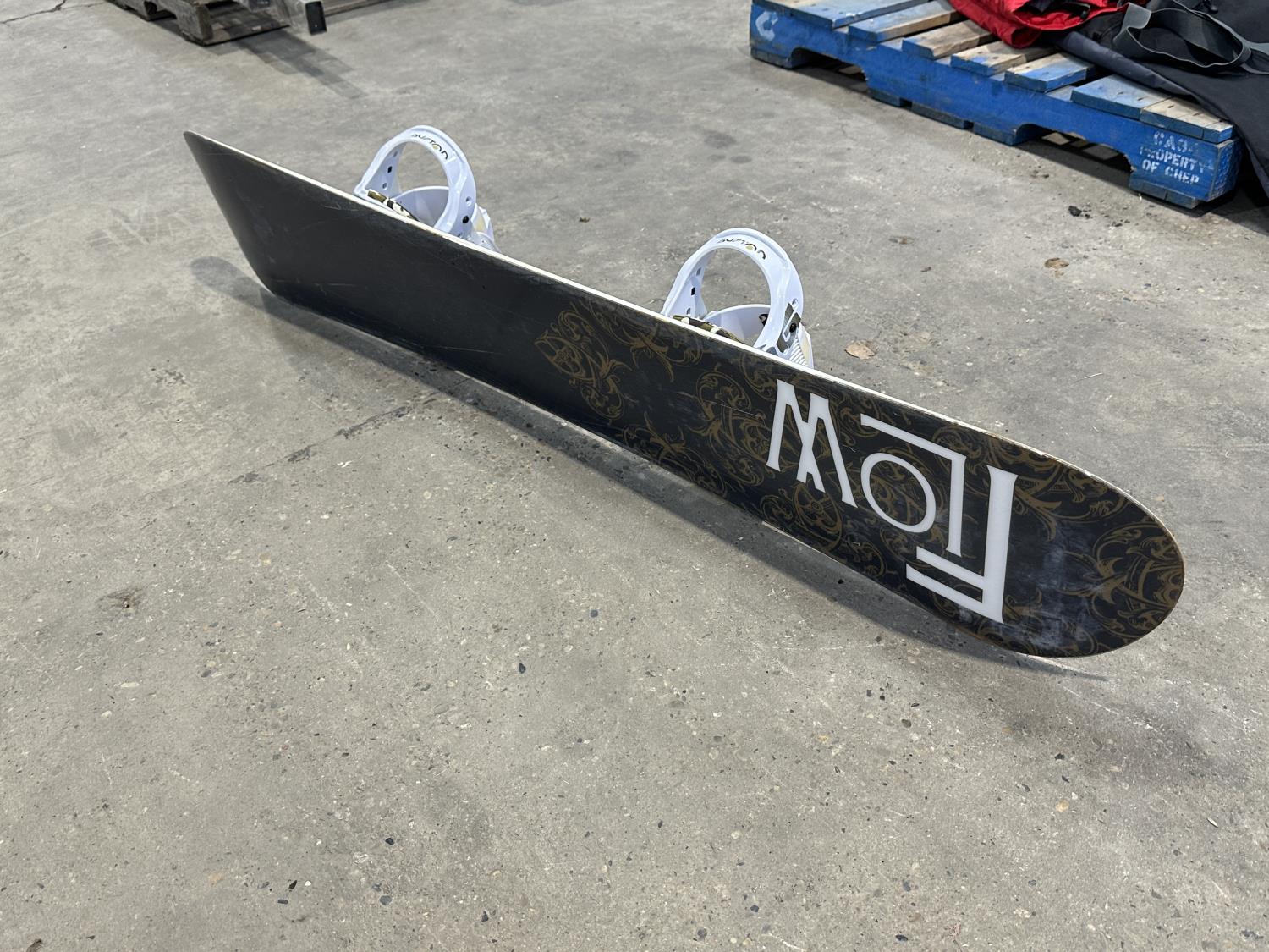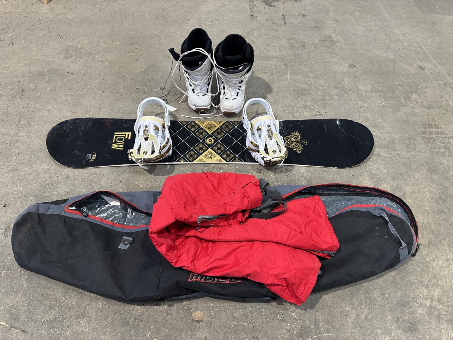 Flow Strike 155 snowboard, Rossignol size 10.5 snowboard boots, ski goggles, gloves, Firefly size XL ski pants, Mole snowboard bag