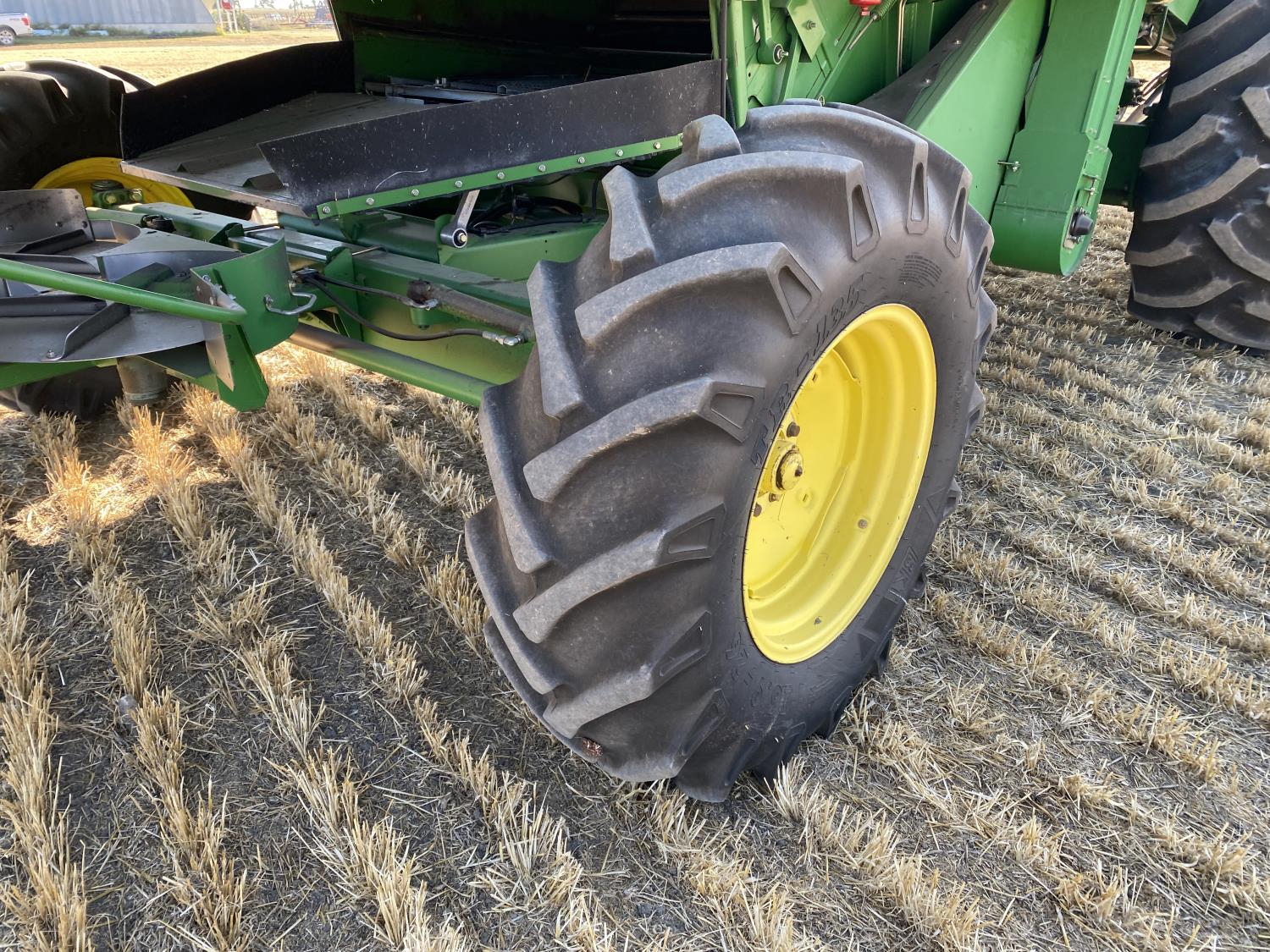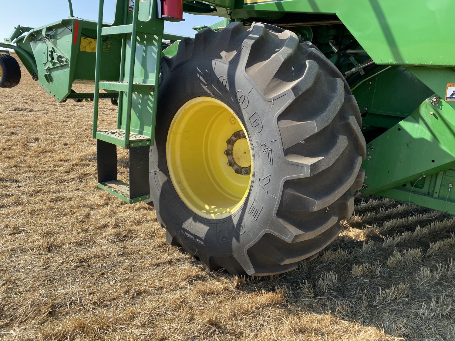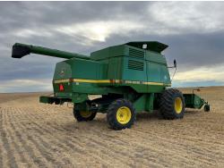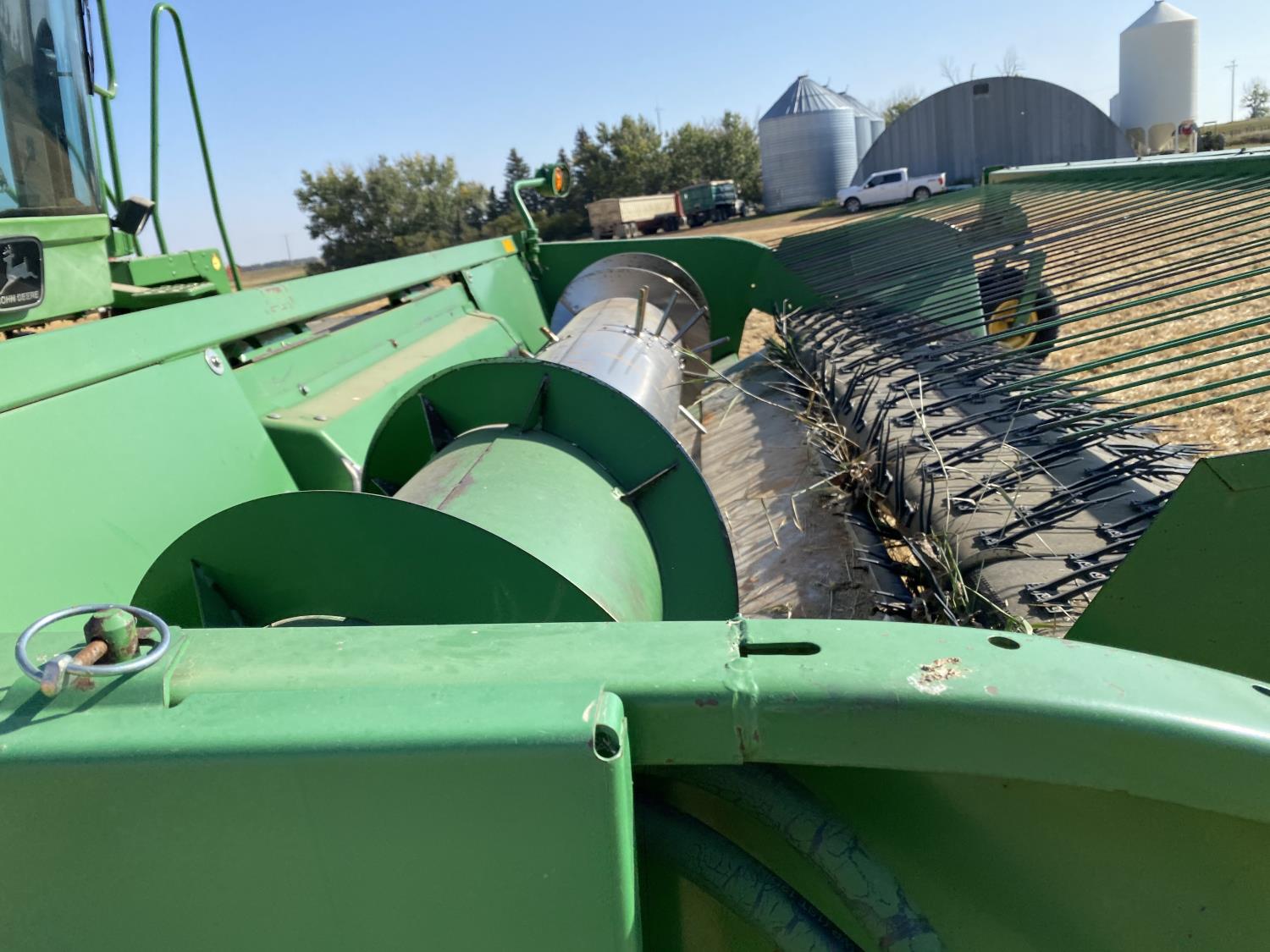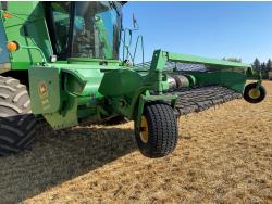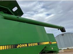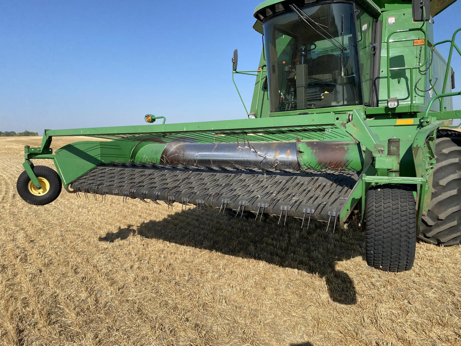1998 John Deere 914 14 ft pick-up header, variable speed reel, fore & aft, reverser, rock trap, chaff spreader, fine cut chopper/spreader, grain tank extensions, 18 ft auger, A/C, buddy seat, 30.5-32 front tires, 16.9-26 rear tires