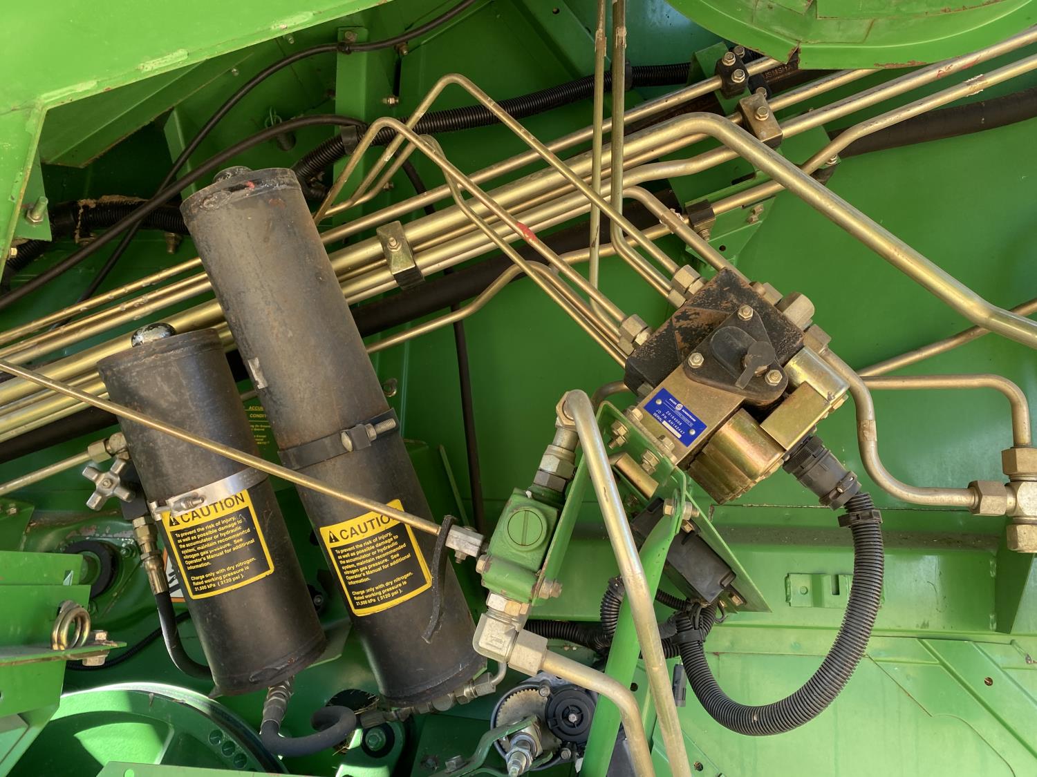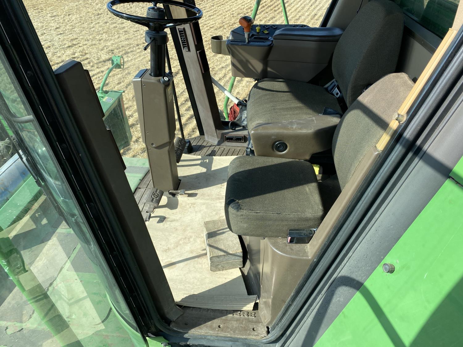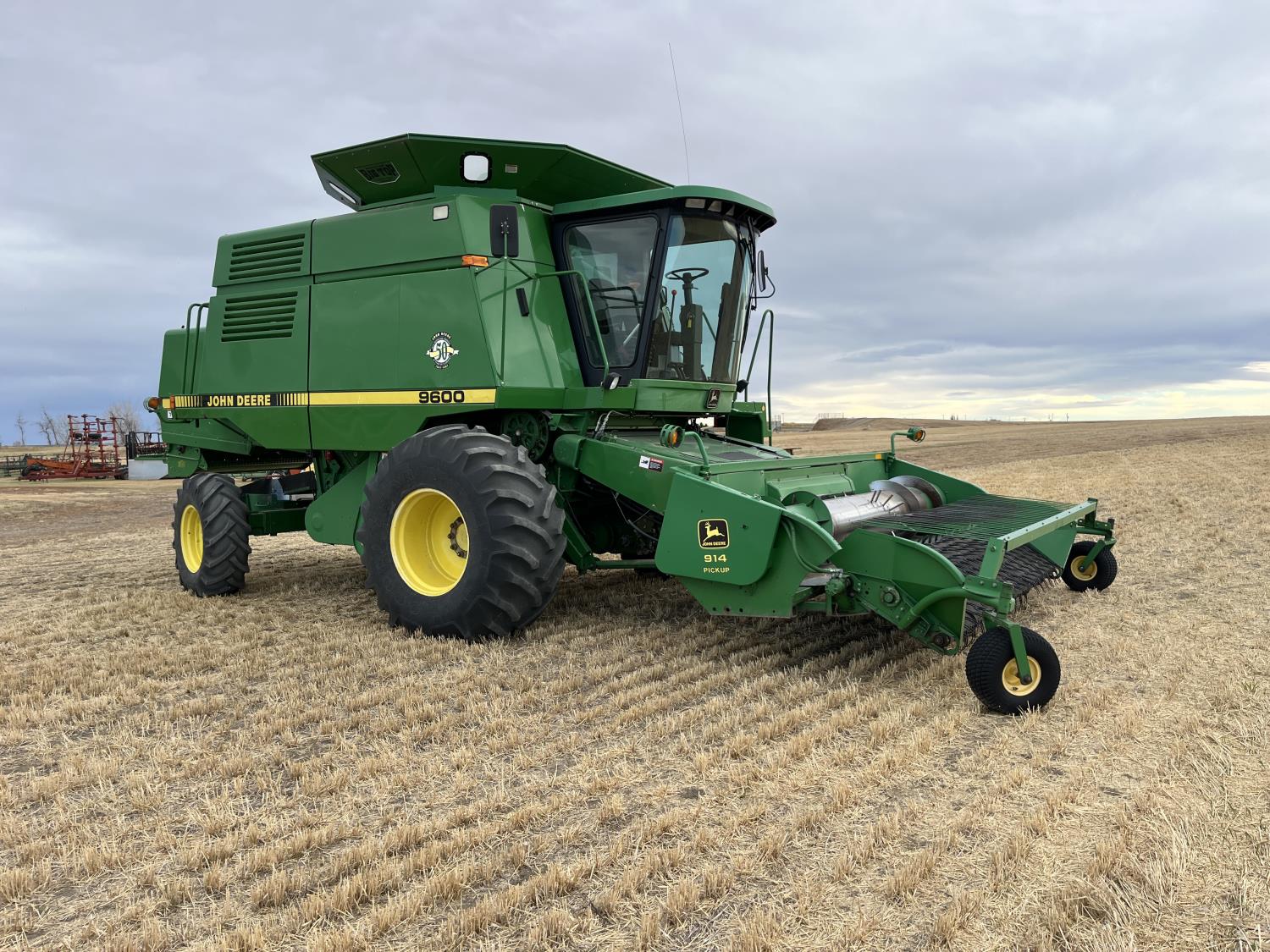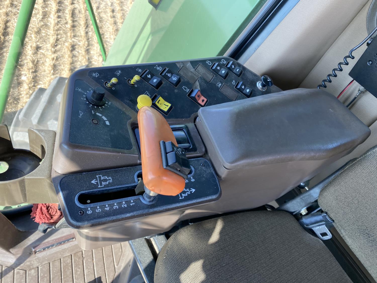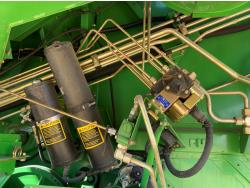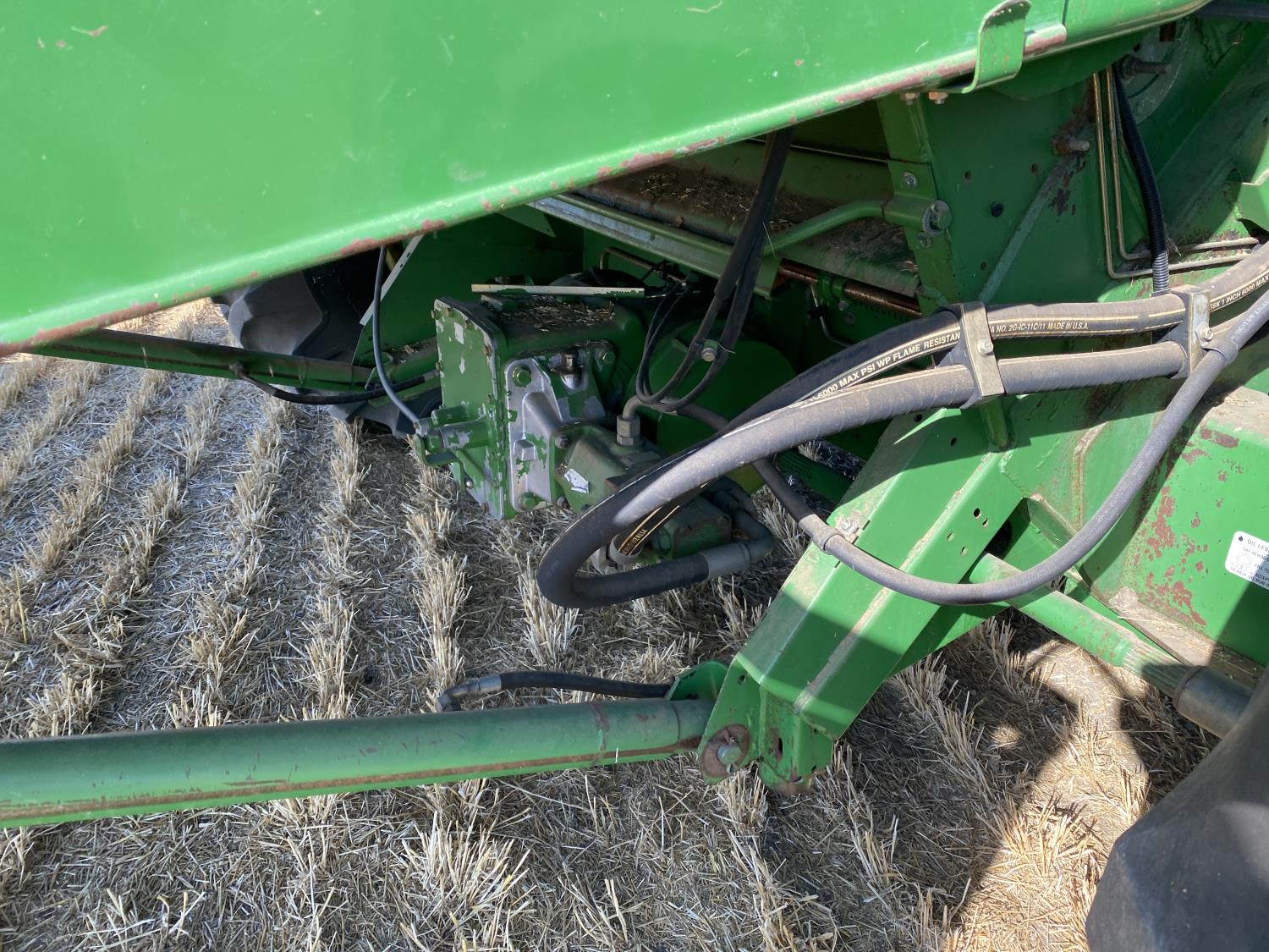 1998 John Deere 914 14 ft pick-up header, variable speed reel, fore & aft, reverser, rock trap, chaff spreader, fine cut chopper/spreader, grain tank extensions, 18 ft auger, A/C, buddy seat, 30.5-32 front tires, 16.9-26 rear tires