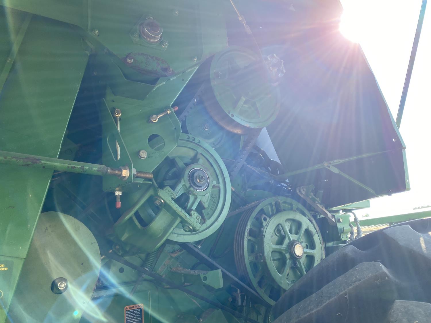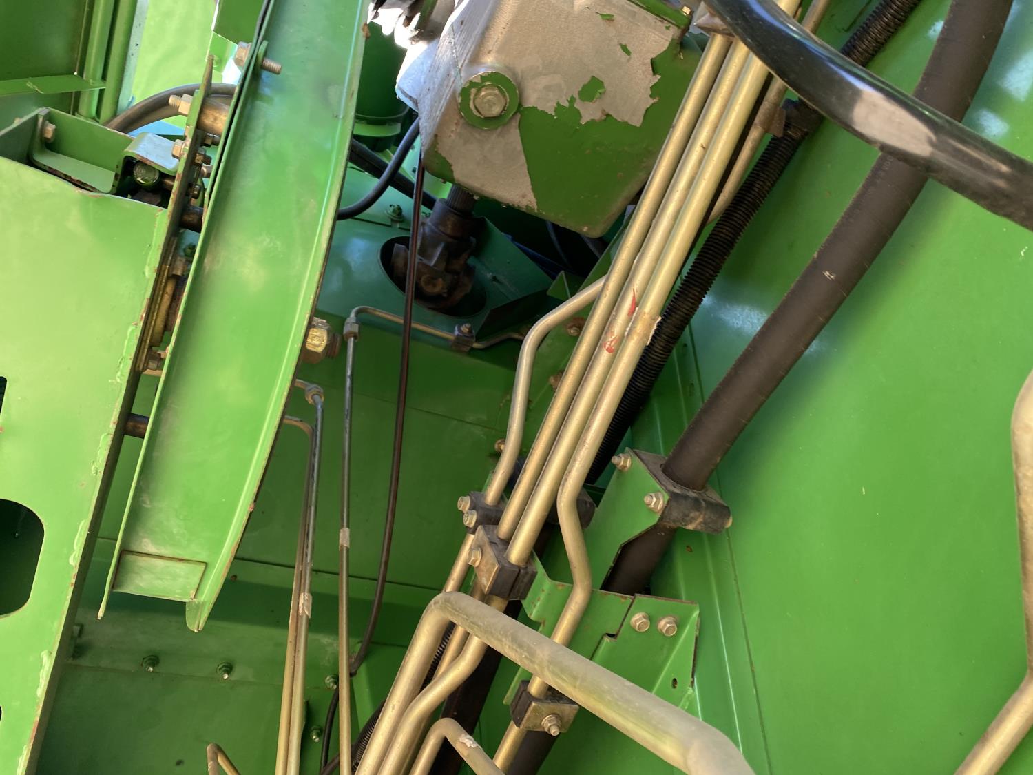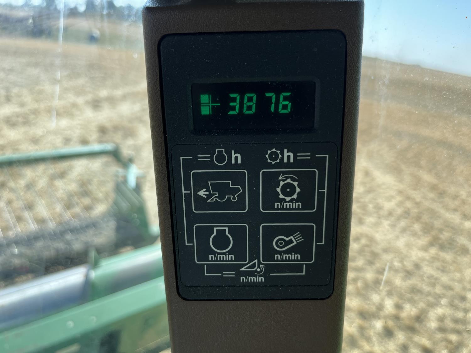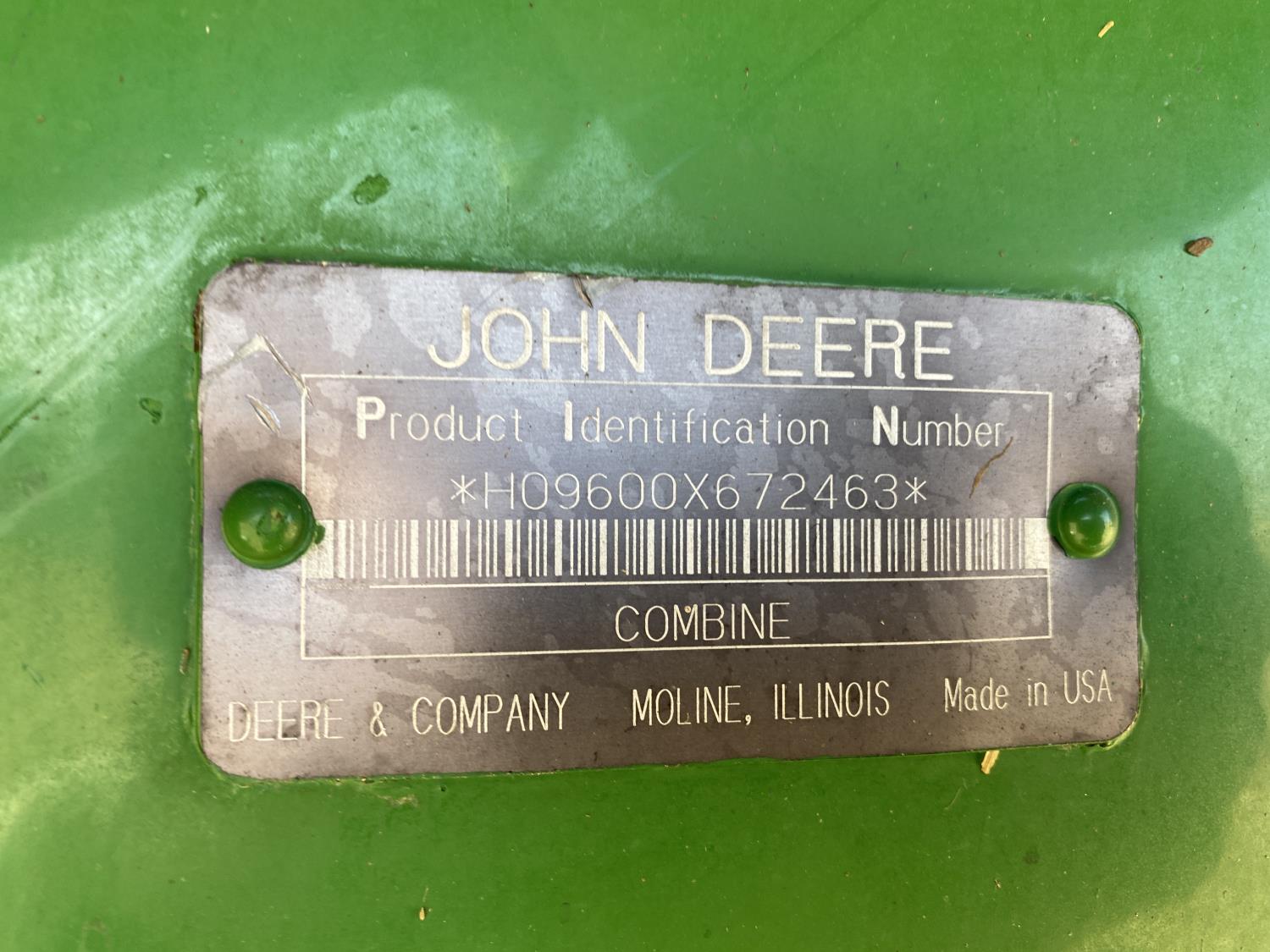1998 John Deere 914 14 ft pick-up header, variable speed reel, fore & aft, reverser, rock trap, chaff spreader, fine cut chopper/spreader, grain tank extensions, 18 ft auger, A/C, buddy seat, 30.5-32 front tires, 16.9-26 rear tires