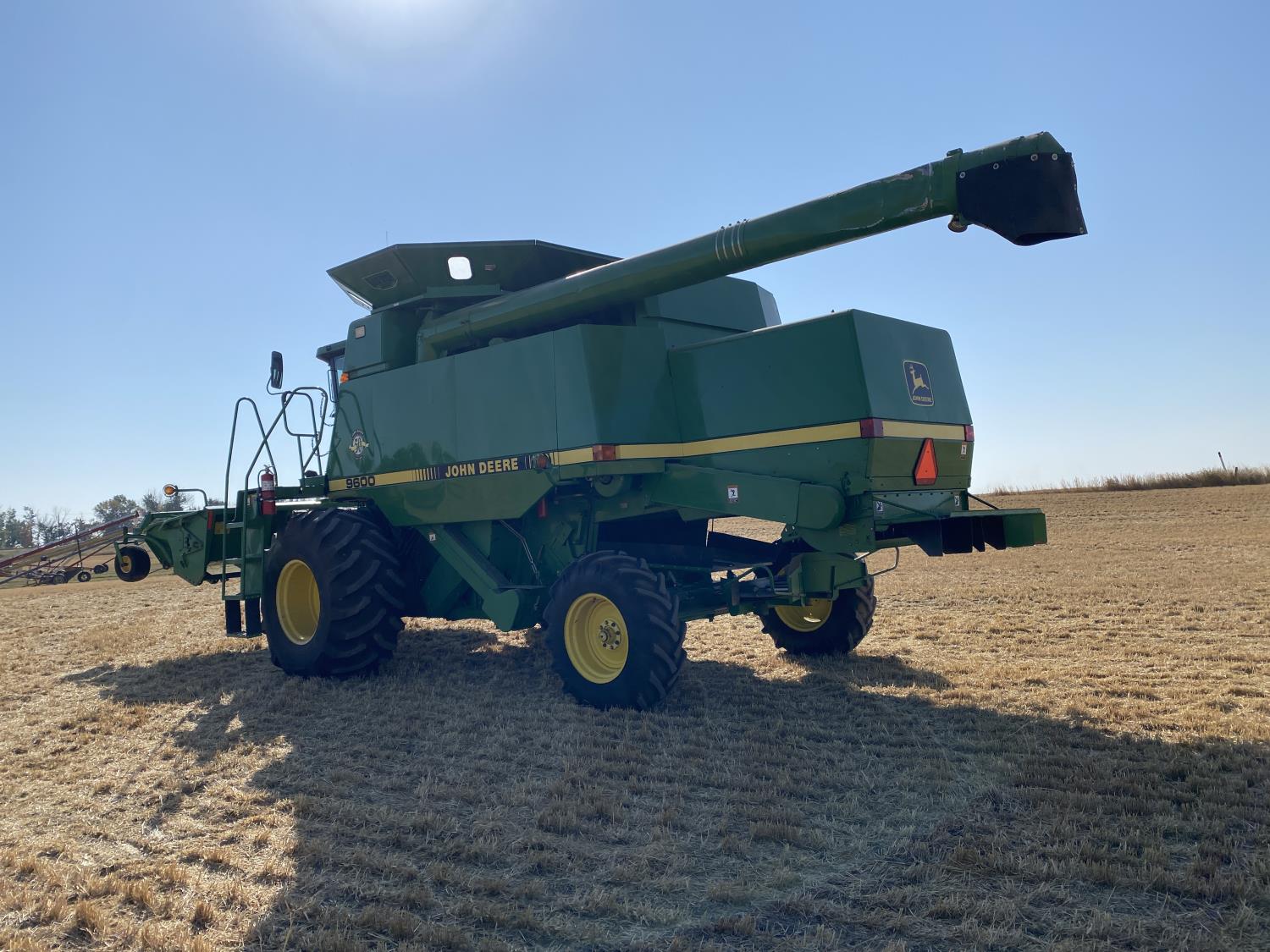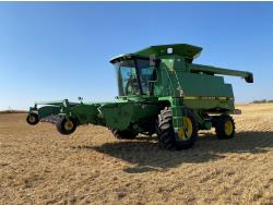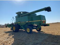 1998 John Deere 914 14 ft pick-up header, variable speed reel, fore & aft, reverser, rock trap, chaff spreader, fine cut chopper/spreader, grain tank extensions, 18 ft auger, A/C, buddy seat, 30.5-32 front tires, 16.9-26 rear tires
