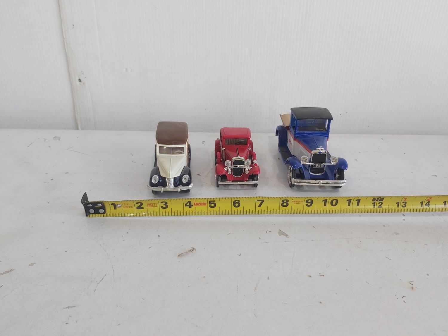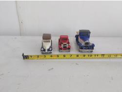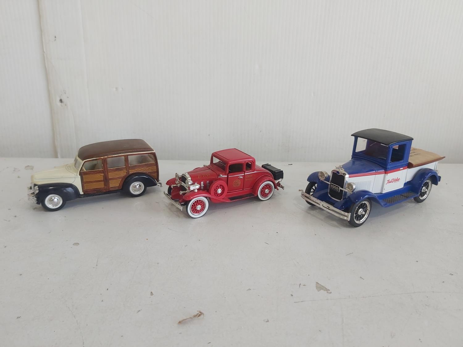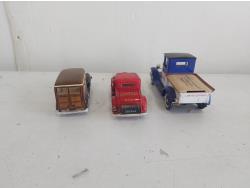 scale unknown, (1) 1940's Ford Woody Wagon, 1932 Chev Fire Chief, 1923 Chev Pickup (Bank)