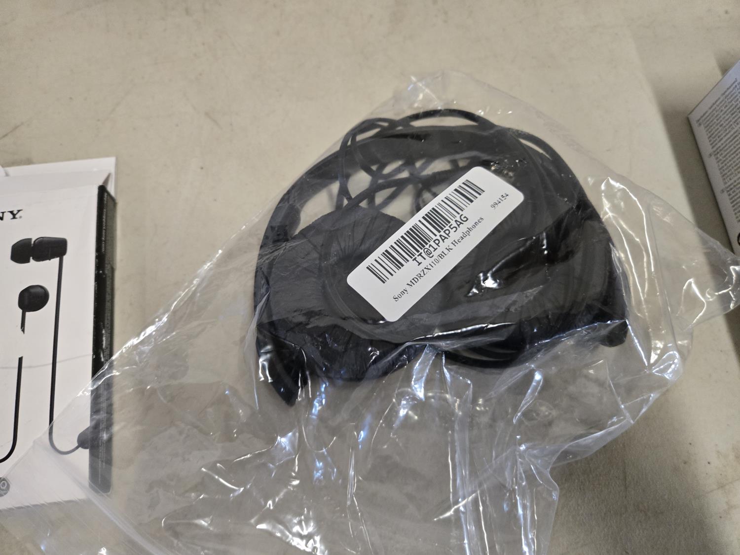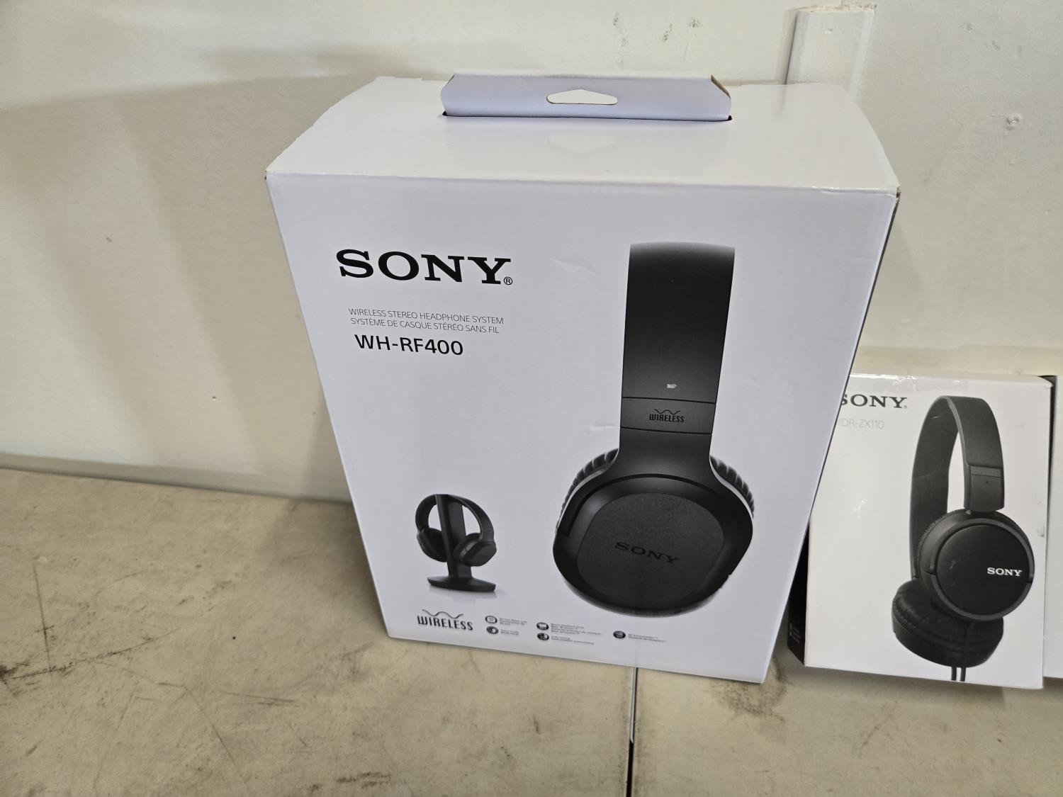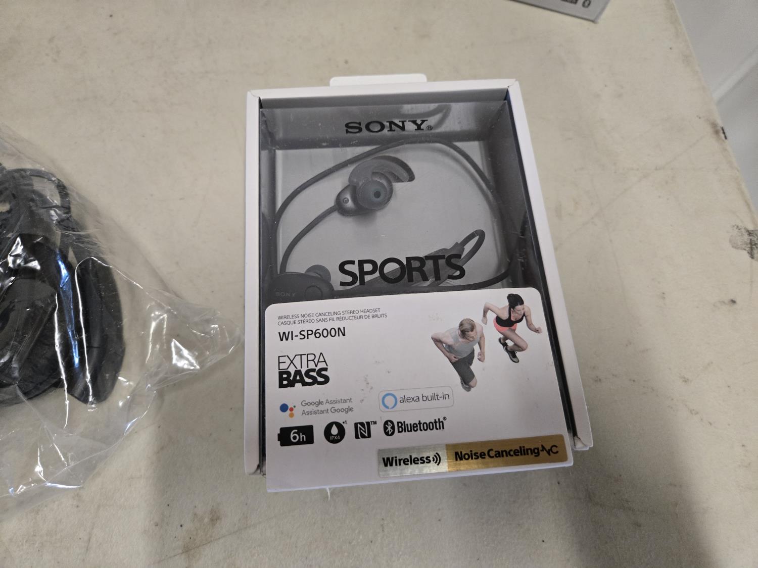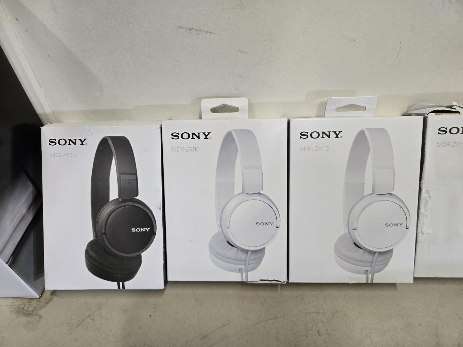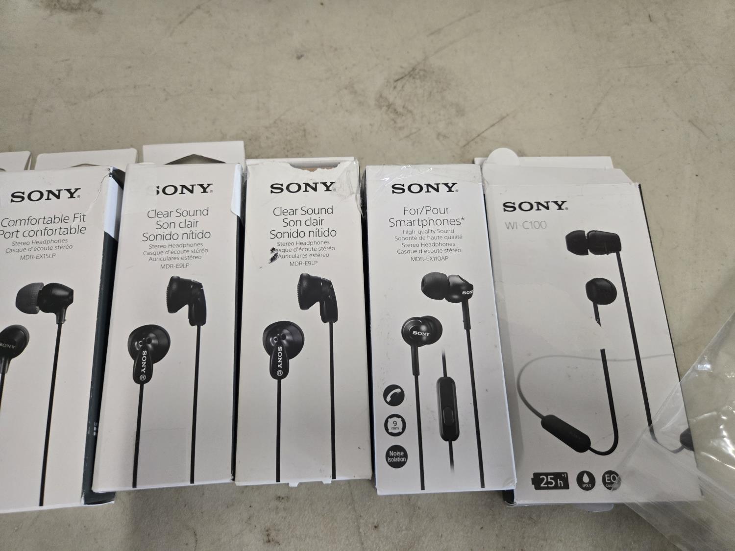 (1) wireless head set, (5) head sets, (8) head phones, (1) noise cancelling head set, (1) Sony wireless speaker