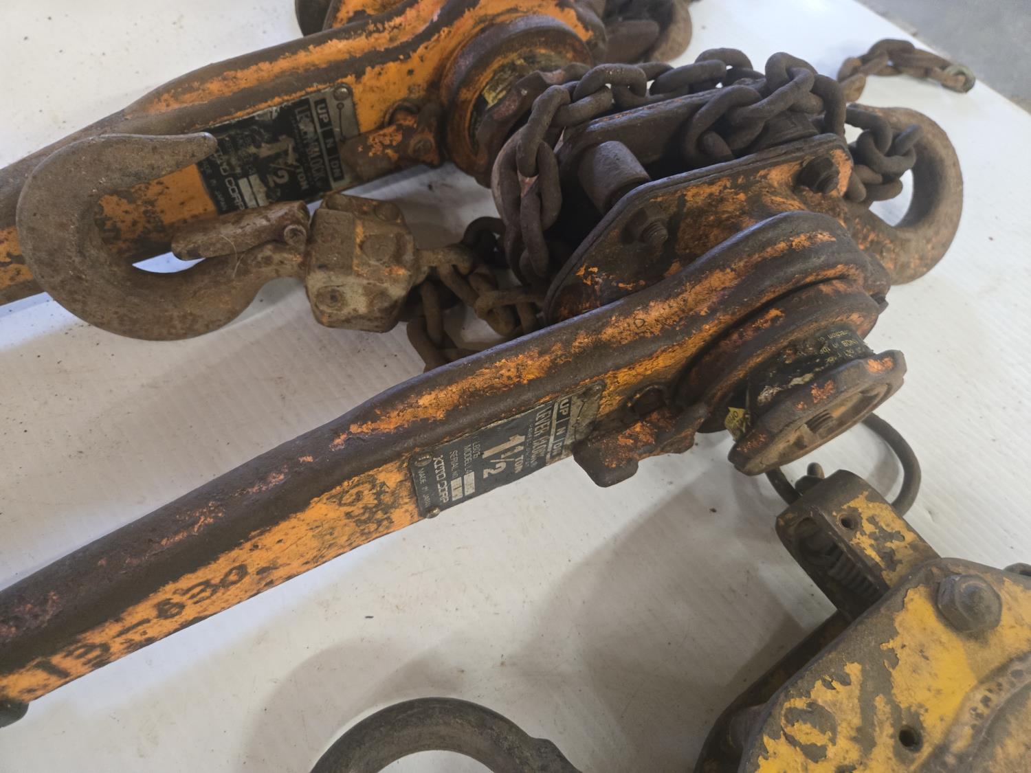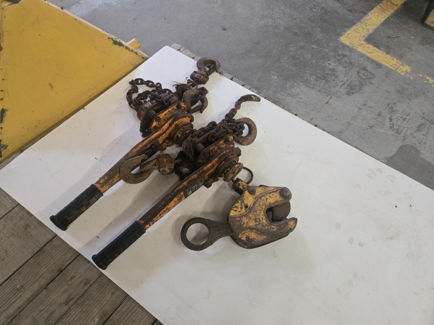 7216 (2) Kito 1-1/2 Ton Come-a-Longs, (1) Metal Plate Lifting Clamp