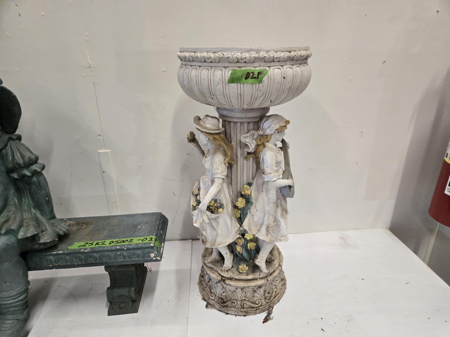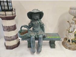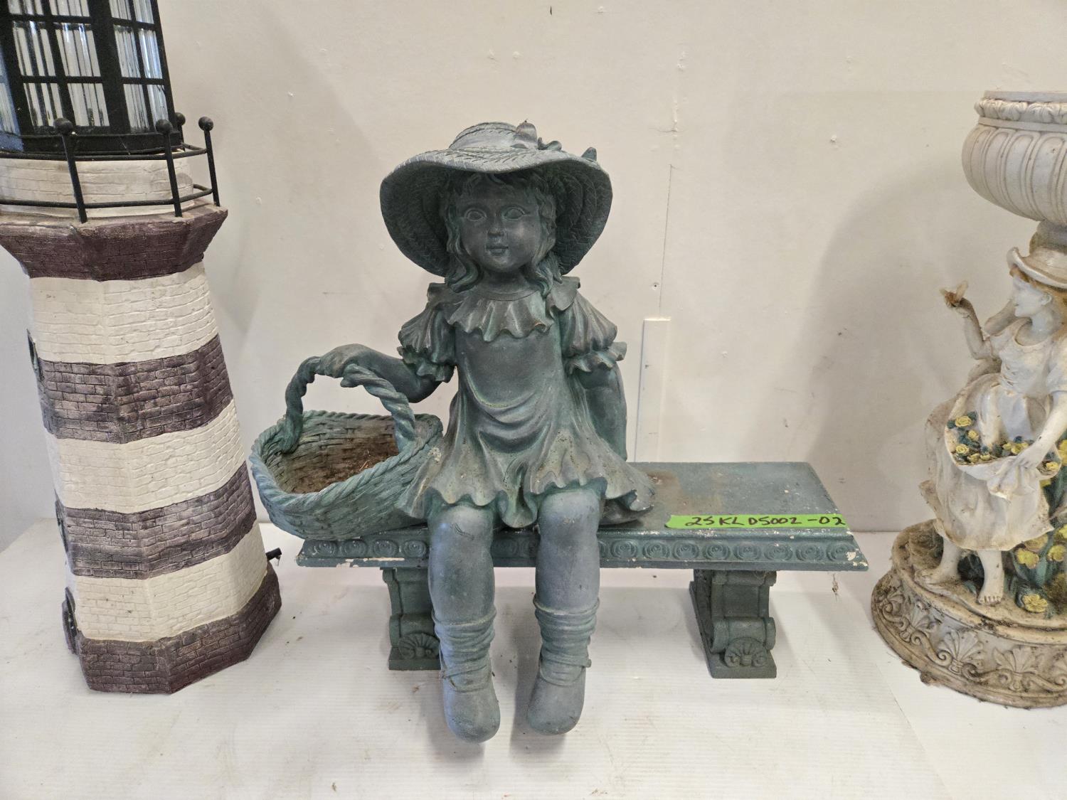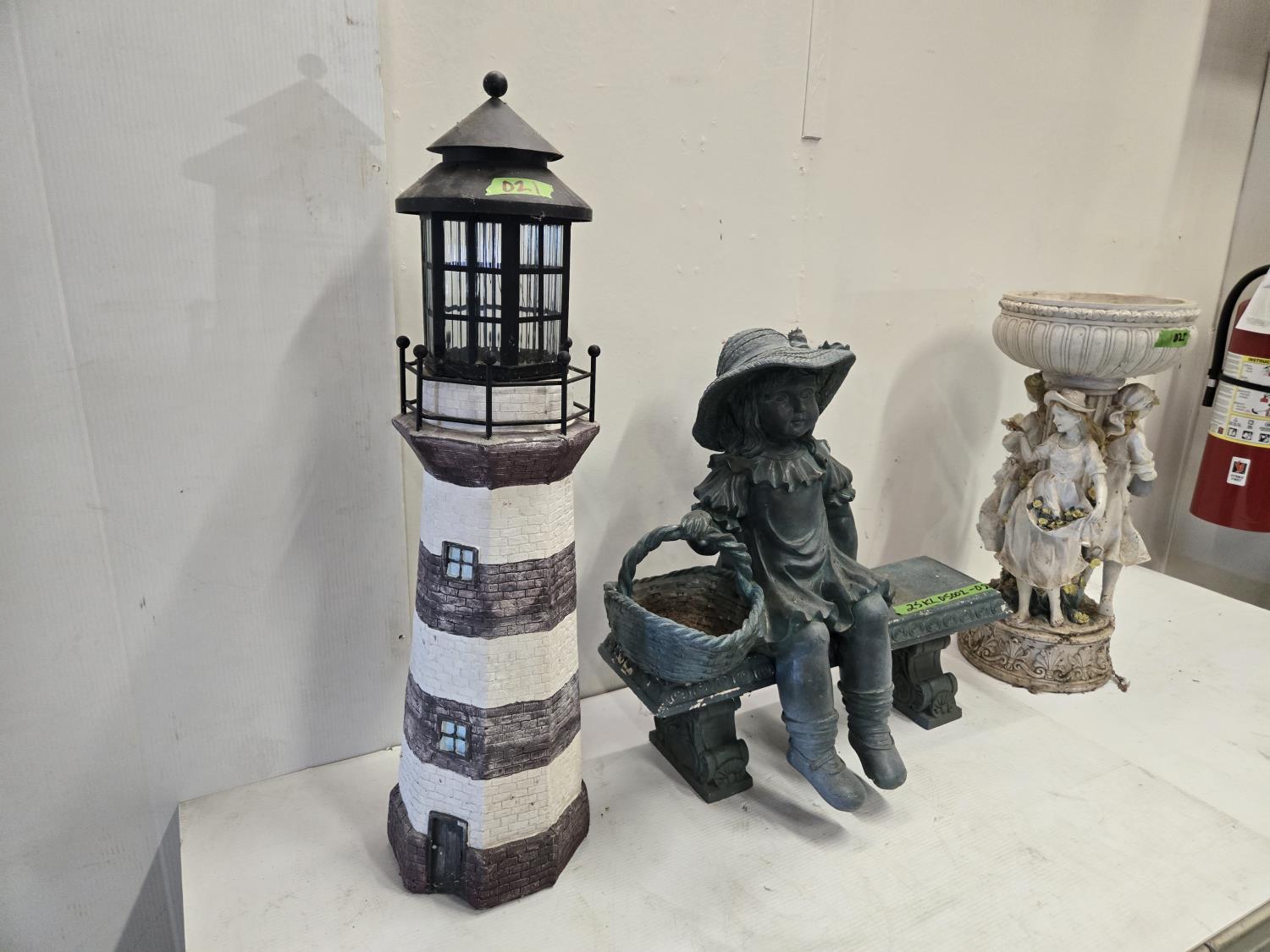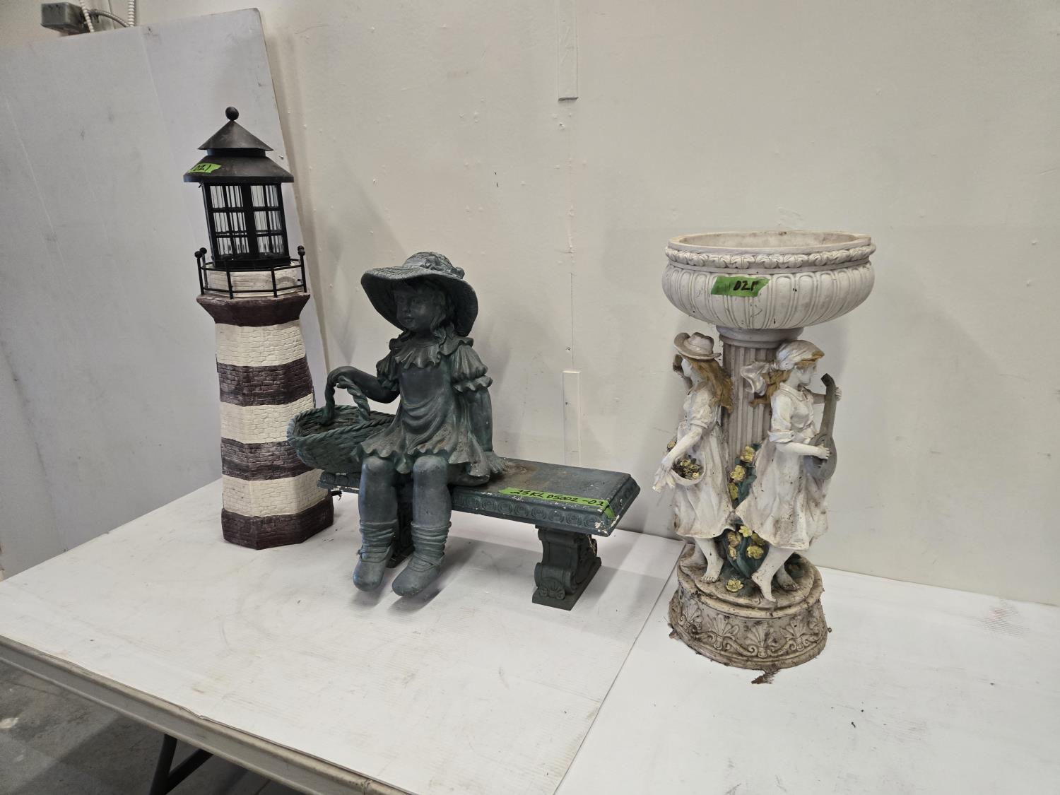 light house, bird bath, girl on bench