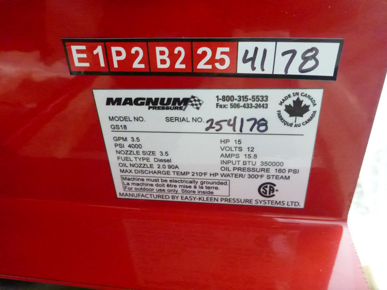 3.5 GPM at 4000 PSI, 15 HP, gasoline engine, electric start, 12 volt burner, oil/diesel fired burned/thermostat, schedule 80 coil with stainless steel housing, fully welded, powder coated frame, 10 gallon poly fuel tank, 30 ft hose and wand