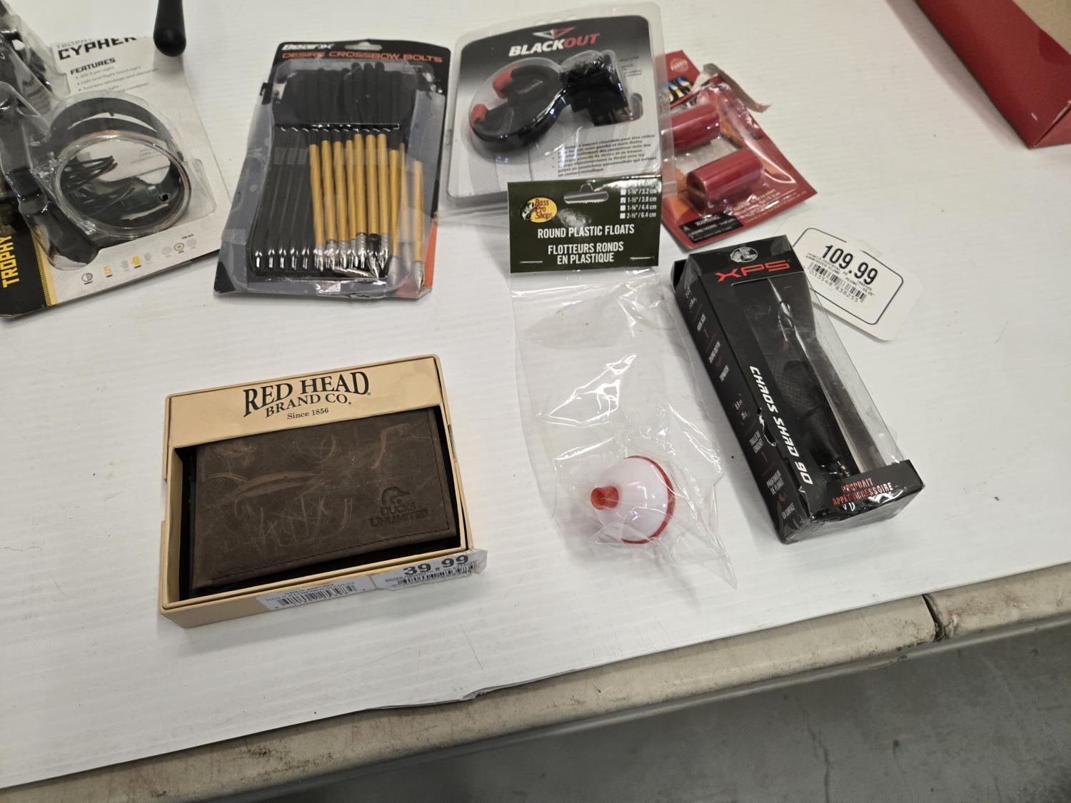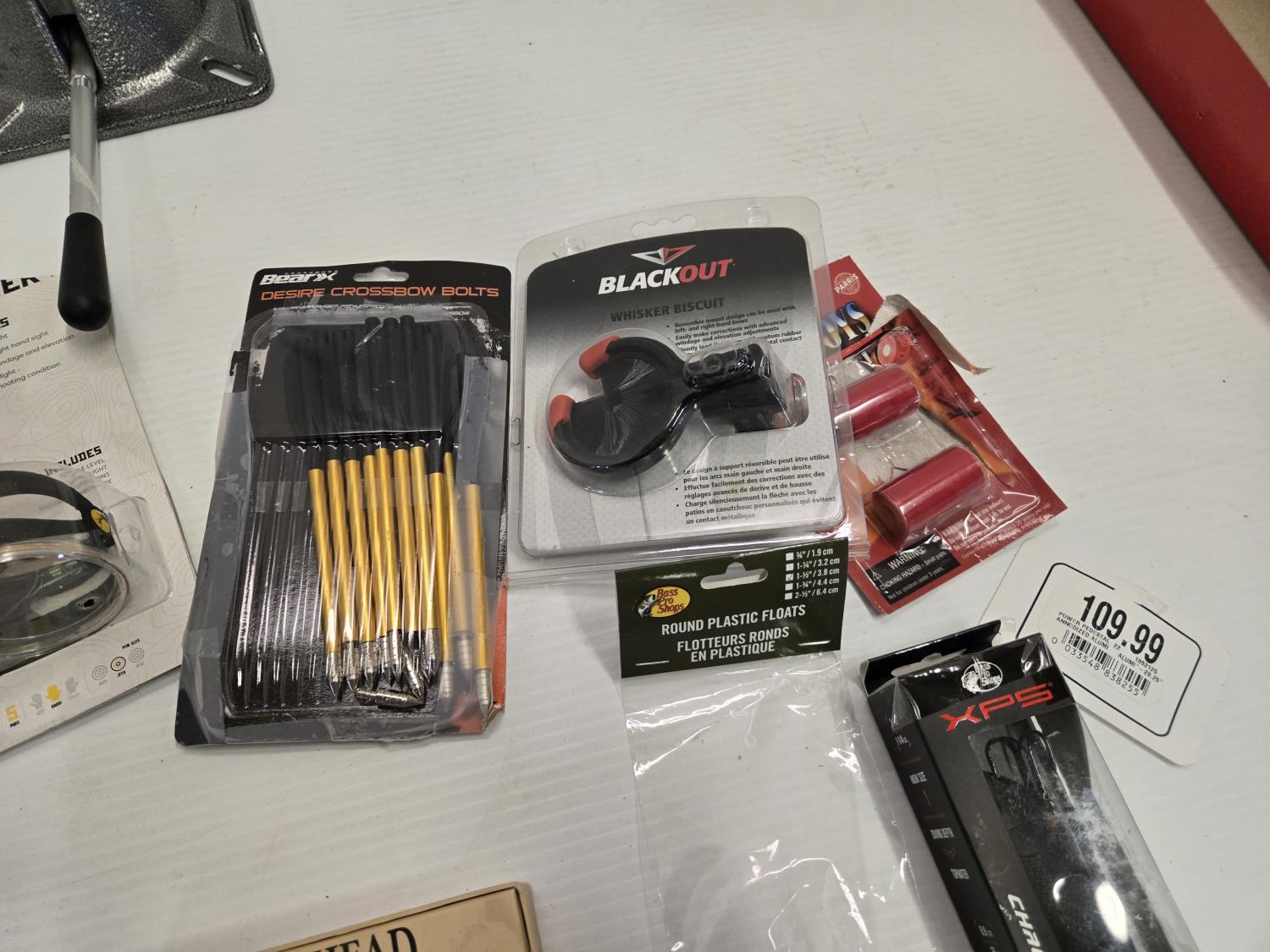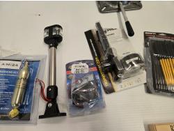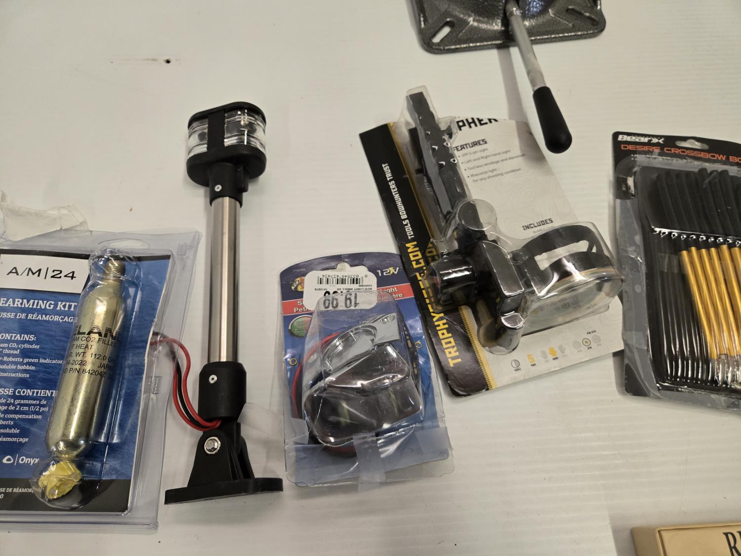 (3) CO2 cylinders, boat light, wallet, fishing float, caps, cross bow bolts, miscellaneous items, power pedestal, Bass Pro Shop Return, Items are sold as is and may have defects or missing parts, Personal inspection is advised