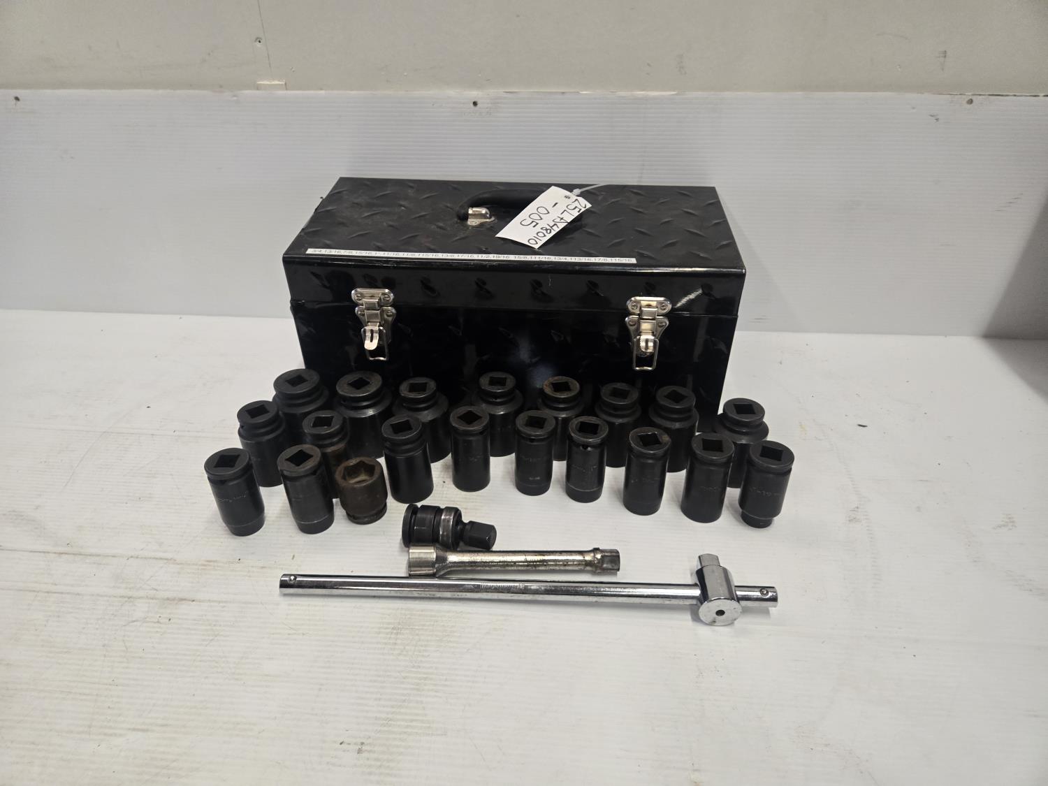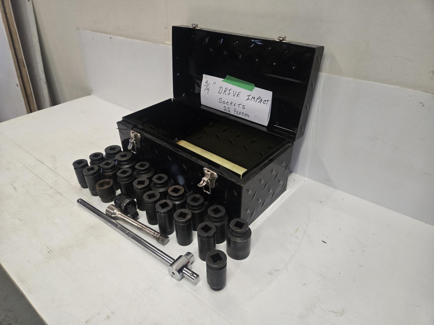 22 pieces, comes with toolbox, sizes 3/4", 13/16", 7/8", 15/16", 1", 1-1/16", 1-1/8", 1-3/16", 1-5/16", 1-3/8", 1-7/16", 1-1/2", 1-9/16", 1-5/8", 1-11/16", 1-3/4", 1-13/16", 1-7/8", 1-15/16" universal
