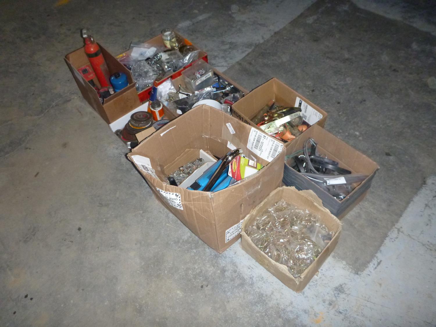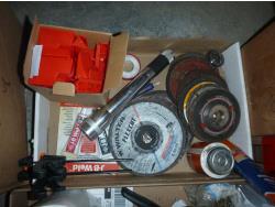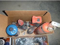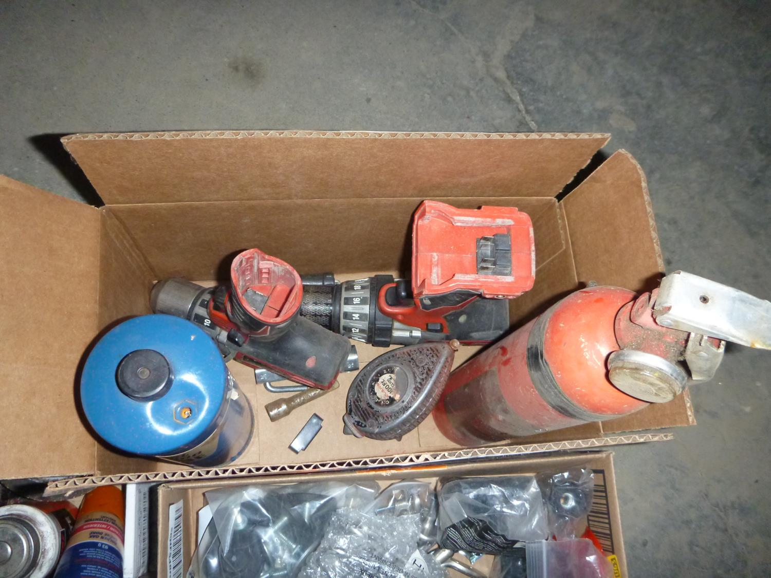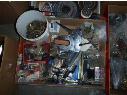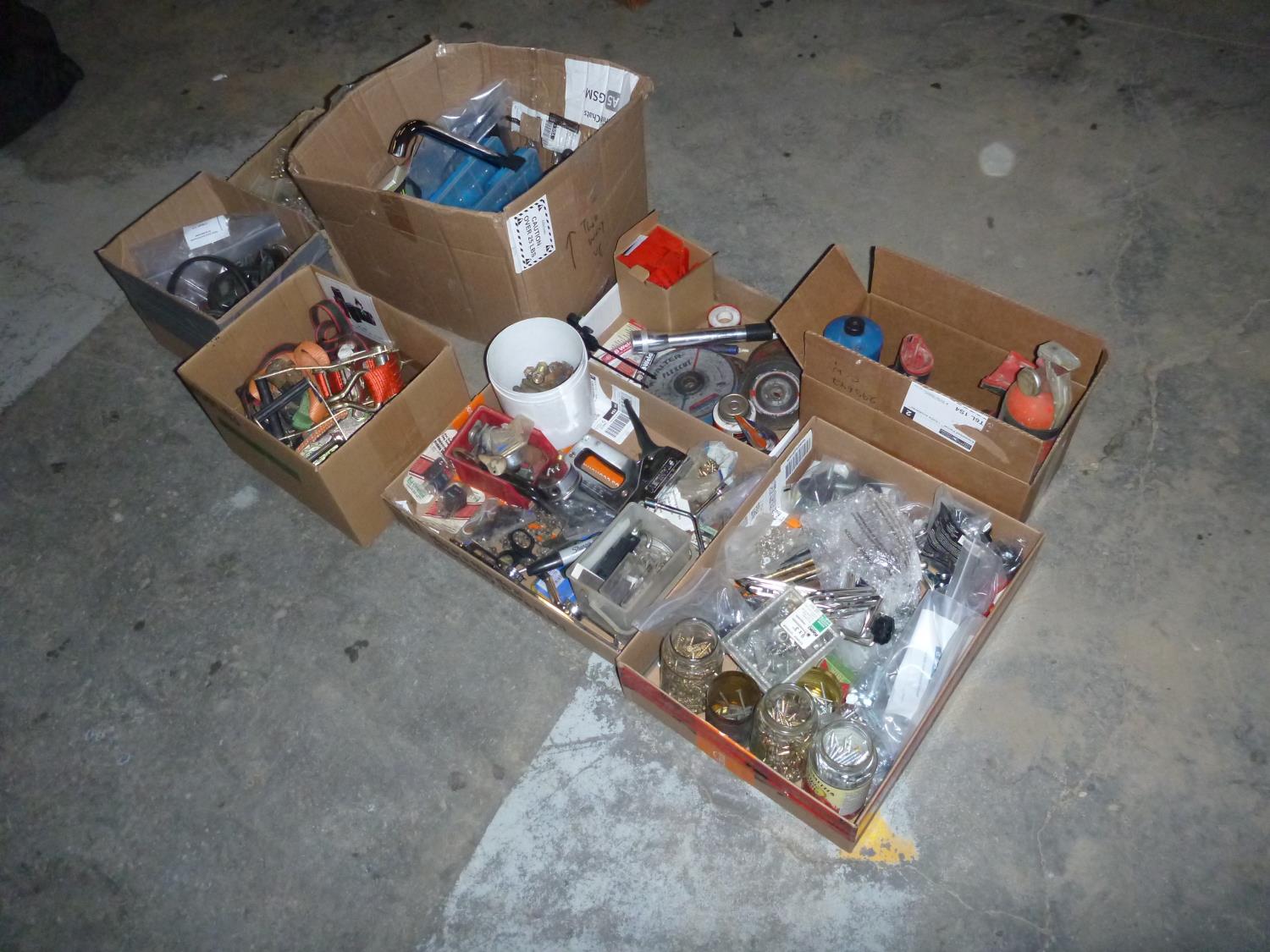Parts trays, screws, nails, bolts, shelf brackets, hinges, casters, chains, electrical parts, adhesives, assorted hand tools, grinding/cutoff wheels, magnetic tool holders, ratchet straps, bungee cords, old milwaukee drills (light powers on with trigger but no rotation).