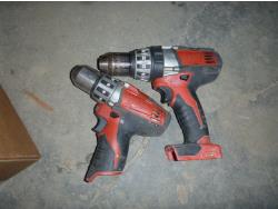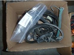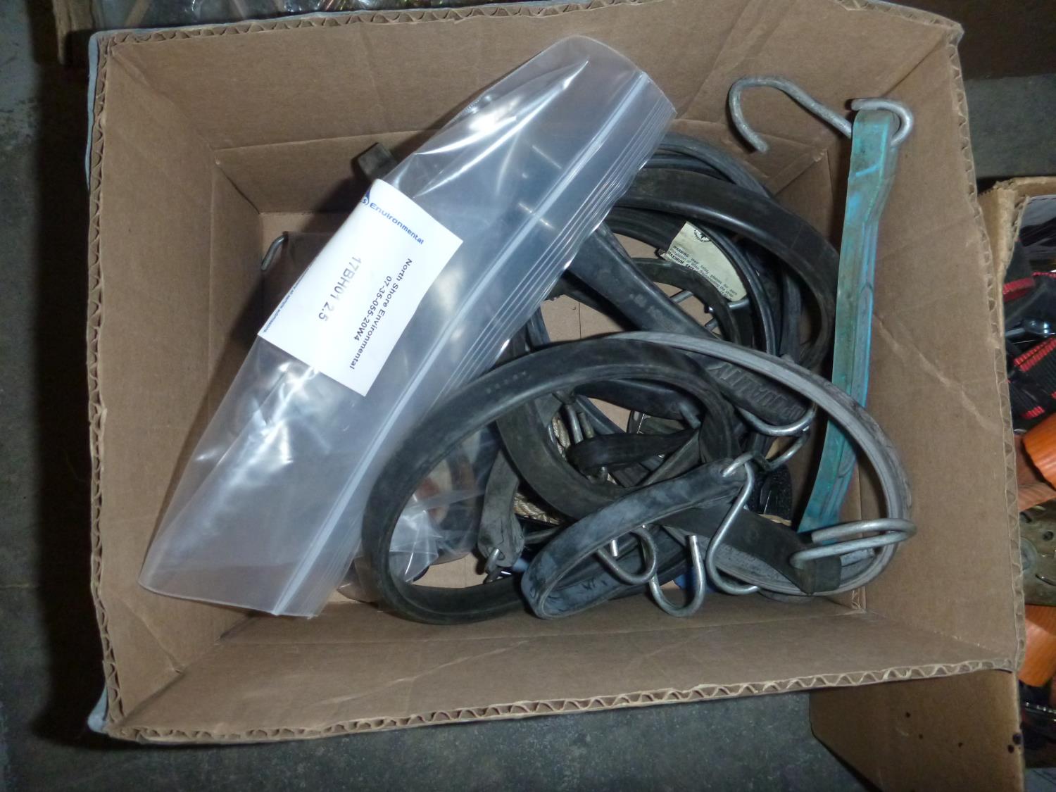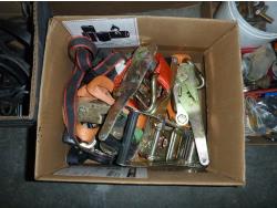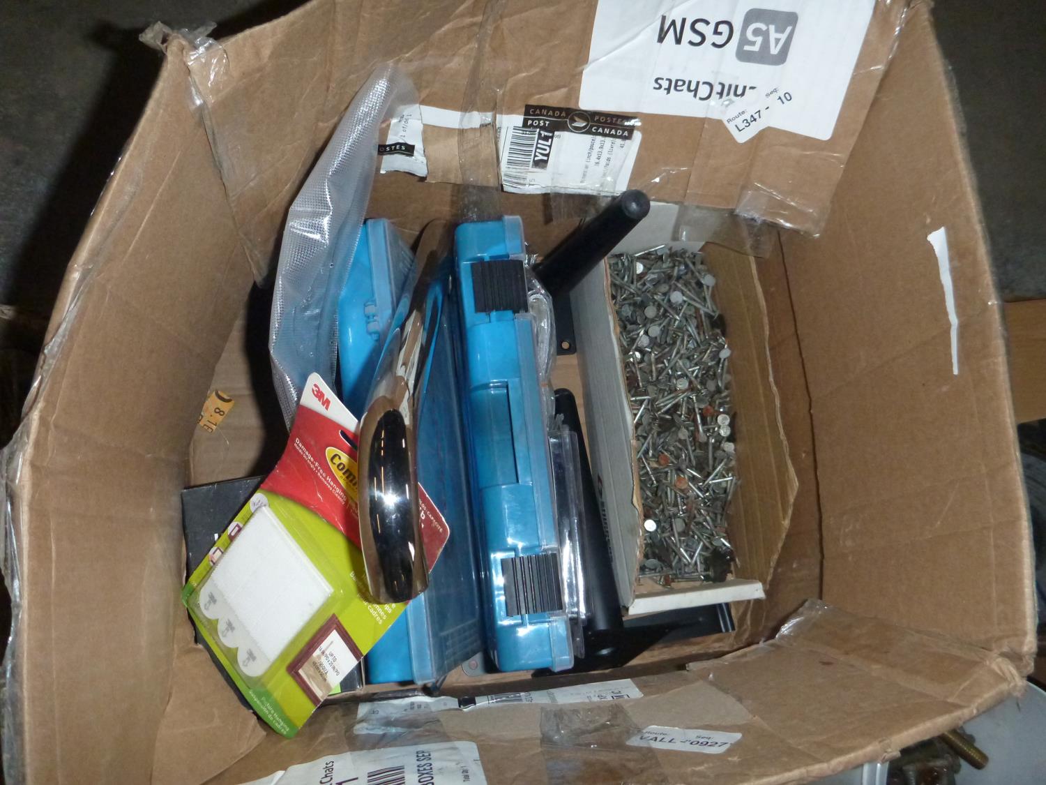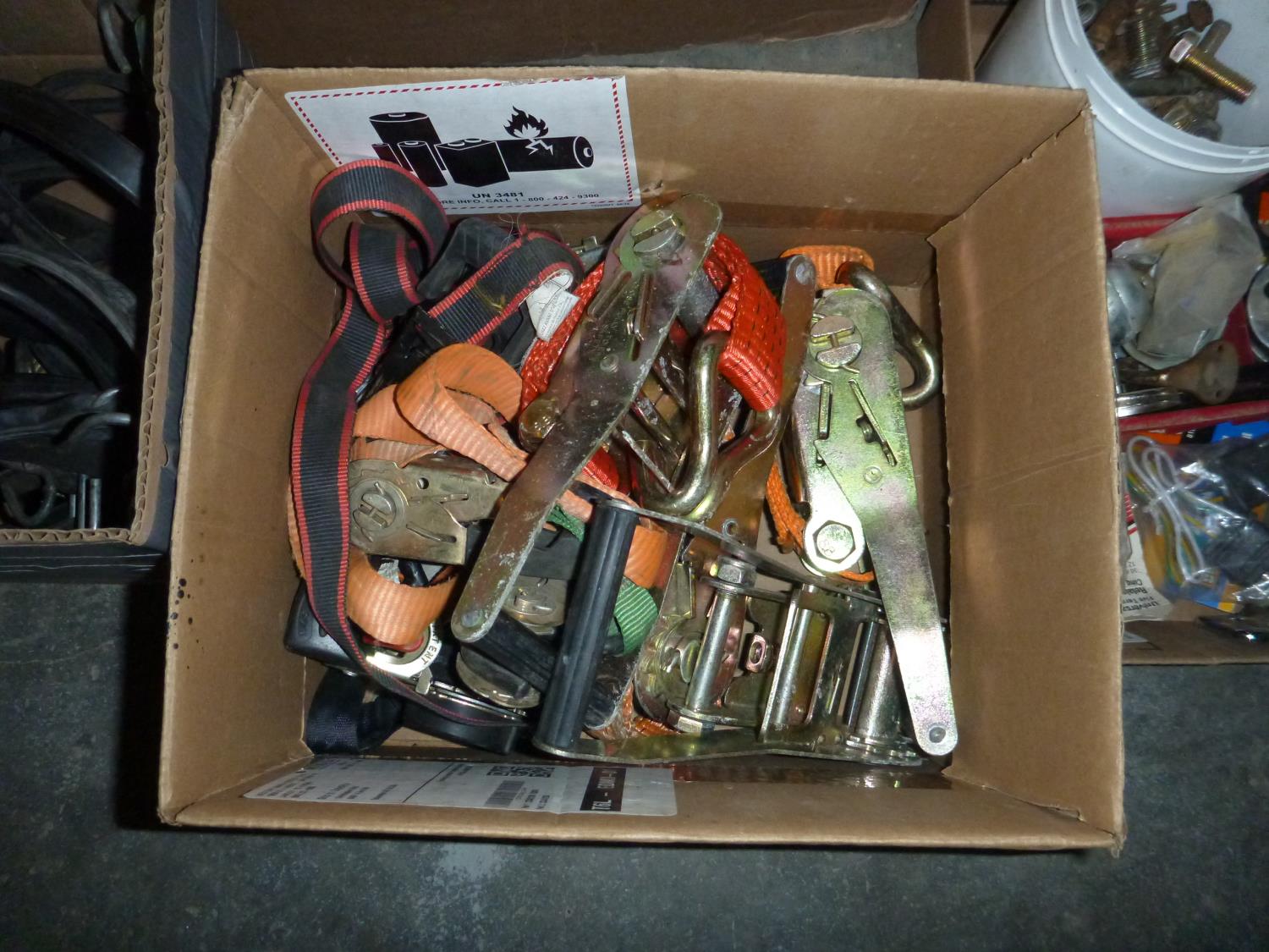 Parts trays, screws, nails, bolts, shelf brackets, hinges, casters, chains, electrical parts, adhesives, assorted hand tools, grinding/cutoff wheels, magnetic tool holders, ratchet straps, bungee cords, old milwaukee drills (light powers on with trigger but no rotation).