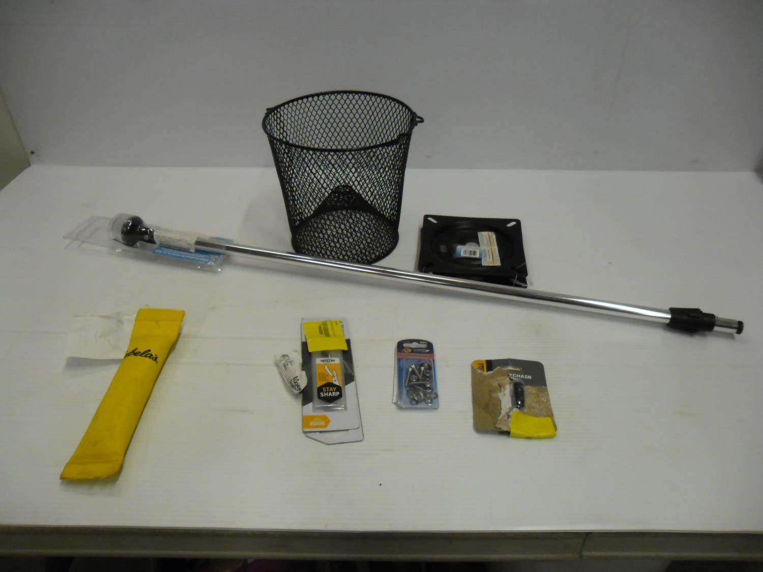 1/2 of a minnow trap, swivel chair base, fire house dummie, replacement knife blades, keychain light, phillips oval head machine screw bolts, washers & nuts