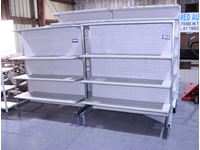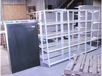 (2) lite duty shelves, (1) shelf unit green, (1) new in box shelf unit