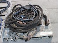 ratchet strap, bucket of misc. bolts, booster cables, various pieces/sizes of used stove pipe