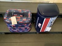 tote cooler holds up to 12 cans, sling cooler holds up to 10 cans, both have handles and shoulder straps. Waterproof, leak proof and insulated w/outside zipper pocket