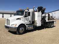 Paccar ISC8.3, 300 HP, exhaust brake, Allison 3500RDS A/T, Hendrickson A/R suspension, 14596 lb front, Dana S23190 23,000 lb rears, 248 in. WB, 5.57 ratio, 10 ft bed, 2012 Hiab 200-5, ctr mtd folding boom, dual ctrls, hydraulic outriggers, s/n 20004747, Central air compressor w/Honda GX340 engine, 2 ft x 4 ft man basket, 12R22.5F, 11R22.5R, AB CVIP 08/2021, 11,011 hrs, 369,206 kms