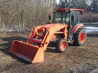 Kubota L1055 loader, 6' bucket, joystick, 3 speed HST transmission, cab, heat, A/C, (2) rear hyd outlets, , 3 pt hitch, 10-16.5 frt & 17.5-24 rear tires, only 396 hrs