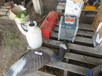 Goose decoys, (2) hand sprayers, Patton heater, wrench set, small tool box with tools