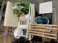 Ladder chair, tv stand, garage cans, plant stand, coat hanger, dust pans