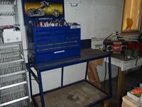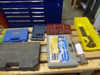 Socket set, wall mount can crusher, (3) cables ties, hose fittings, (2) trouble lights, large wood auger bits, metal tool box