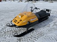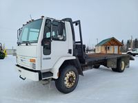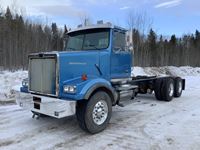 Caterpillar 3406C, 14.6 L 6 cylinder mechanical diesel engine, 3 stage Jacob engine brake, 18 speed transmission, removable mid rise sleeper, 12,000 lb front axle with air ride assist on spring suspension, 46000 lb rears with locking differential and air ride suspension, Magnum Ace headache rack, beacon lights, air sliding 5th wheel, lowbed ramps on rear of frame, set of wheel chains on hanger, all aluminum rims, 11R24.5
