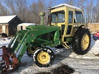 John Deere 320R Loader, 6 ft Q/A bucket, joystick, John Deere 59 inch front mount snow blower, John Deere 366 66 inch front mount blade, Yanmar 1.6 L 3 cylinder diesel engine, power steering, 3 speed hydrostatic transmission, two-post foldable ROPS, 540 PTO, 3 PT with I Match Q/A connector, 7.00-14 front, 11.2-24 rear tires