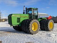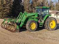 John Deere 740 loader, Q/A 8 ft bucket, grapple, joystick, 16 speed PowrQuad transmission, 3 hydraulic outlets, 540/1000 PTO, engine heater, 16.9-28 front & 520/85R38 rear tires