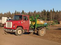 DT466B-A18F, 180 HP, 466 cu in, 6 cylinder, diesel, 4 speed automatic transmission, spring over beam suspension, 9000 lb front, 27080 lb rear, 236 inch WB, 11R22.5 tires, Minoru 18 ft box, s/n LBM210, 2 ft silage extensions, grain & silage gates, roll tarp