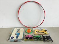 Hula hoop, masks, toys