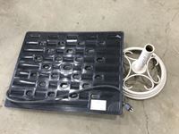 Helmet, fishing rods, floor mats, sprinkler, ear muff, wheel barrow 10 inch tires