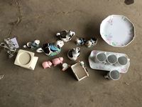 Porcelain cow tea set, salt & pepper shakers, napkin holder, porcelain tea cups and serving plates