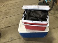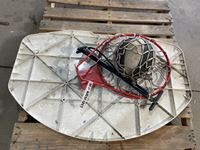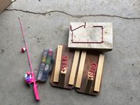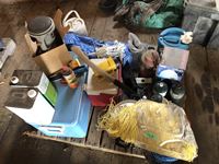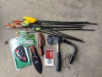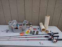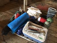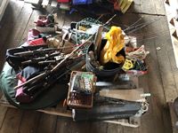 Qty of fishing rods, craw fish trap, 1 man ice fishing tent, tackle box, life jackets, live bait bucket, rain coat, miscellaneous