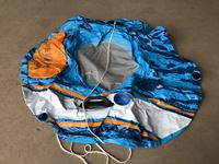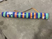 Kerosene lamps, poly shelf, size 10 boots, water jug, cooler, bungee cords, umbrella with clamp, tarp, sleeping mat, splitting axe, camping chair
