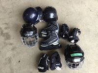 Youth skates, (2) hockey helmets, (2) pair gloves
