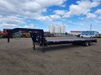 8-1/2 ft wide x 25 ft long flat deck plus 2 ft tilt extension, c/w removable pipe bale rack sides, (2) 7000 l b axels, 235/85 R16 tires