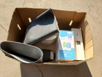 Assorted filters, 50 lb 1-1/2 inch fencing staples, tape, bolt bin, Hi-Qual adjustable horse stall wall connectors