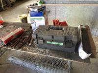 Flare kit, face shield, airbrush set, wax bars, (3) John Deere 20-1/2 inch mower blades, c-clamp, steel wool, vet kit with syringes, ear punch, ear tags, horse shoes