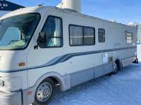 GMC V8 gas engine, automatic transmission, hydraulic brakes, gas engine generator, roof mount A/C, furnace, fridge and top freezer, oven, kitchen sink, microwave, bathroom with sink, toilet, shower, stereo, TV, DVD player, one large awning, 2 window awnings, 5300 lb front axle, 9840 lb rear axle, 19 inch dual wheels.