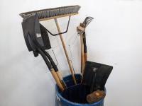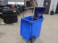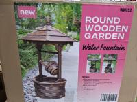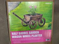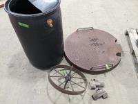 1994 Poly Rain Barrel, Metal Spoke Wheel, Well Cover