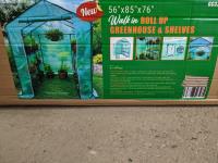 56 inch x 85 inch x 76 inch, rollup door, wire shelves