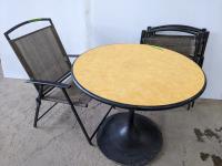 1749 (4) Folding Patio Chairs and 36 Inch W X 29 Inch H Round Table