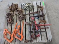 (4) Crosby USA 1/2 inch ratchet boomers, (2) WLL 3/8 inch - 1/2 inch load boomers and (2) 1/2 inch x12 ft GR70 chains
