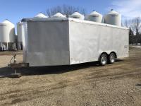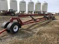 front and rear axle steering, spring suspension, hydraulic brakes on all 6 wheels, telescopic hoist, rear hydraulic lift end gate with grain chute, removable silage extensions, plus c/w custombuilt 20-inch hydraulic drive rear mount grain unloading auger that is set up to come on and off the trailer in minutes