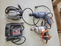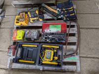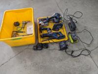 circular saws, 6" ice auger, 16" electric chain saw, reciprocating saw, 19" hedge trimmer, drill, sander, battery charger