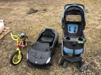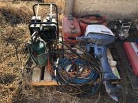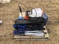 Solar fencer, electric fence supplies, miscellaneous screws, garden supplies, BBQ kit, tool box, John Deere mulch kit