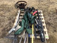 Powerfist air nailer, air hose reel, electric heater, puller kit, Makita cordless drill, paint, miscellaneous screws and bolts, joist hangers