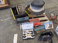 Collets, mouse tarps, miscellaneous hardware, magnetic tool holder base, measuring tools, misc hardware