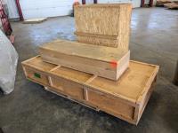 plywood, stainless steel, aluminum roll, oak formica 98" x 4" sheet, homebuilt wood bed for truck box 43 1/2" x 73" (damage to one side), 48" x 9 1/2" steel plate, decorative indoor wood lathe, 5' square plywood, 5' x 4' plywood