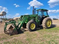 John Deere 280 loader, Q/A, 96 inch bucket, grapple, bale forks, mid mount hydraulic connection, John Deere 7.6 L 6 cylinder 157 HP, diesel engine, 140 PTO HP, 15 speed power shift transmission, cab, ROPS, joystick, A/C, radio, 540/1000 PTO, 3 point hitch, 2 rear hydraulic outlets, rear wheel weights, 16-9-26 front tires, 20.8-38 rear tires