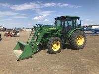 John Deere 563 loader, 84 inch bucket, John Deere 3.0 L 5 cylinder 75 HP, diesel engine, 60 PTO HP, 16 speed power shift transmission, cab, left hand reverser, rear differential lock, A/C, 540 / 540E PTO, 3 point hitch, 2 rear hydraulic outlets, rear wheel weights, 12.4-24 front tires, 18.4R30 rear tires