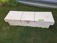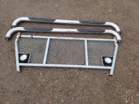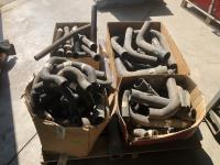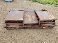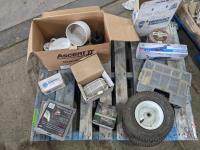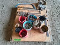 Threaded rod of various thicknesses 2 ft to 10 ft lengths, 2.5 inch x 2.5 inch x16 ft steel tube, 8 inch x 13 ft steel U-channel, qty of tin strips 3 inch x 10.5 ft 1/4 inch steel plate 2.5 inch x 20 ft l, decorative slate: (1) 10 inch x 26 inch, (1) 12.5 inch x 16.5 inch, miscellaneous cuts of steel, right angle decorative brown and white trim: 10 ft l x 1 inch d x 1 inch h, white trim: 45 ± strips, brown: 45 ± strips, (10) right angle white trim: 10 ft x 2-3/4 inch x 1/2 inch, (3) black right angle trim: 10 ft x 2-3/4 inch x 1/2 inch, (4) 10 ft x 8 inch tin, roll plastic 52 inch w